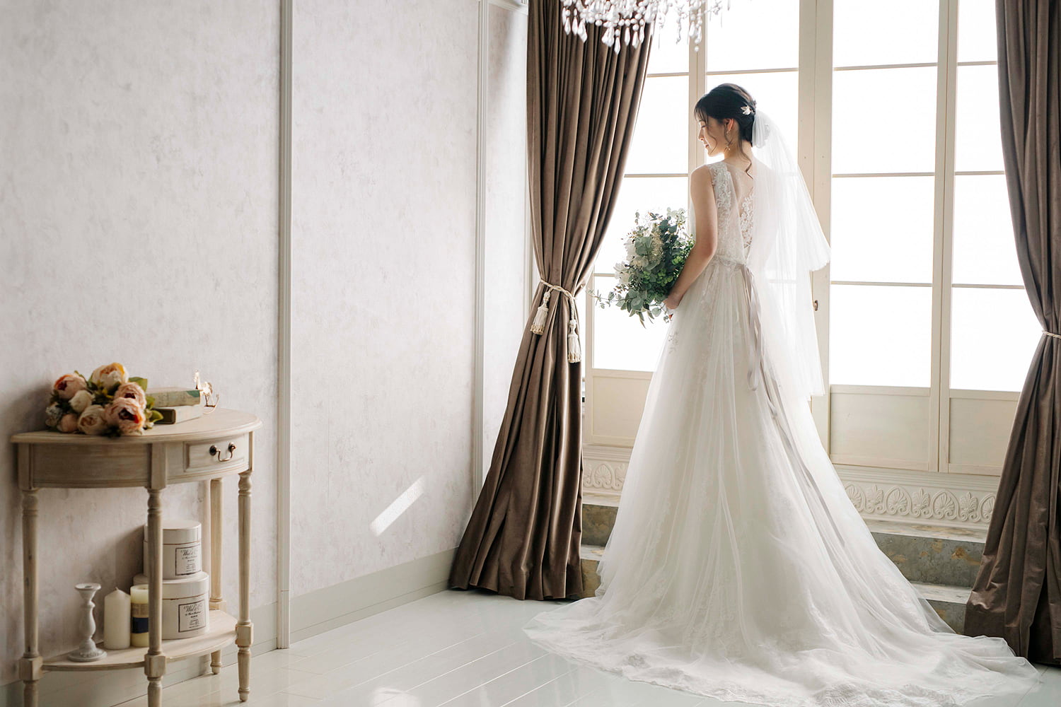 衣裳は、一般のフォトスタジオのような撮影用の衣裳ではなく、実際の結婚式で使用する本物衣裳を撮影時にも使用。当店は多くの結婚式場と提携し、衣裳レンタルもしております。常に500着以上のウエディング衣裳をご用意しております。